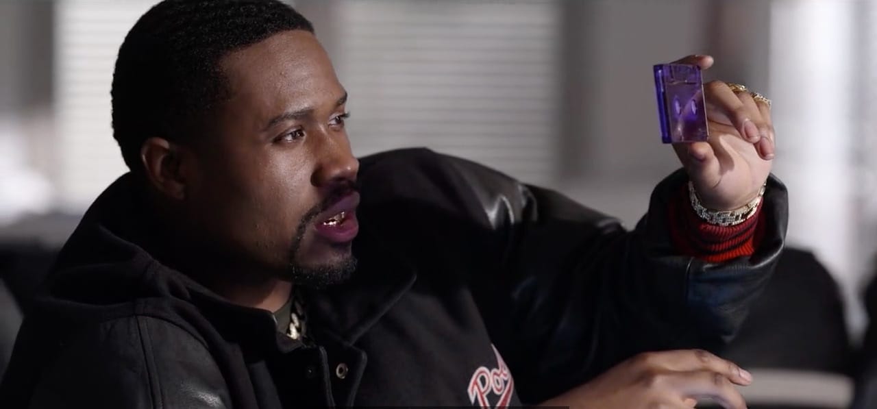 RAEKWON picks up the translucent purple cassette and holds it up to the light.