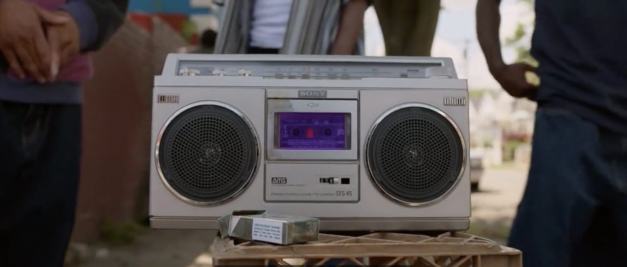A GROUP OF PEOPLE standing around a boombox as someone puts the purple tape in.